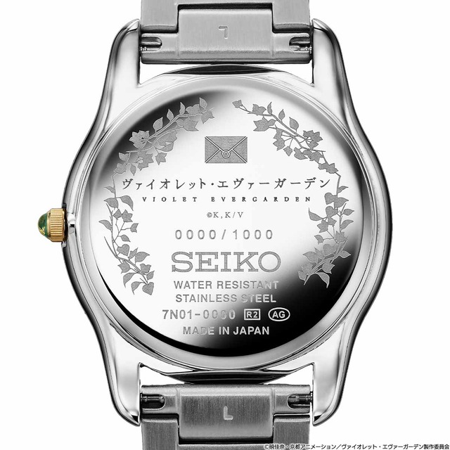 Lalu pola yang terlihat juga sangat mirip seperti kostum Violet berwarna putih-coklat ditambah perpaduan warna hijau pada sisi kanan jam untuk mengatur penunjuk arah yang mirip seperti kalungnya. Dan pada angka jam 6, juga diperlihatkan bunga violet ditambah motif kompas yang mengingatkan kita akan perjalanannya Violet ditengah cerita, serta pada bagian belakang jam versi Stainless Steel juga ditambahkan hiasan bunga Bougainvillea, logo Violet Evergarden, nomor seri yang dirilis dan lainnya. Yaa.. nomor seri perilisan karena jam ini dirilis terbatas sebanyak 1000 pcs saja.